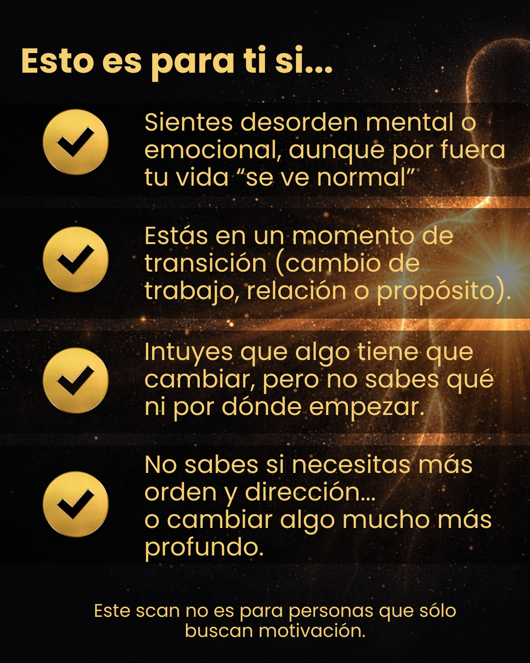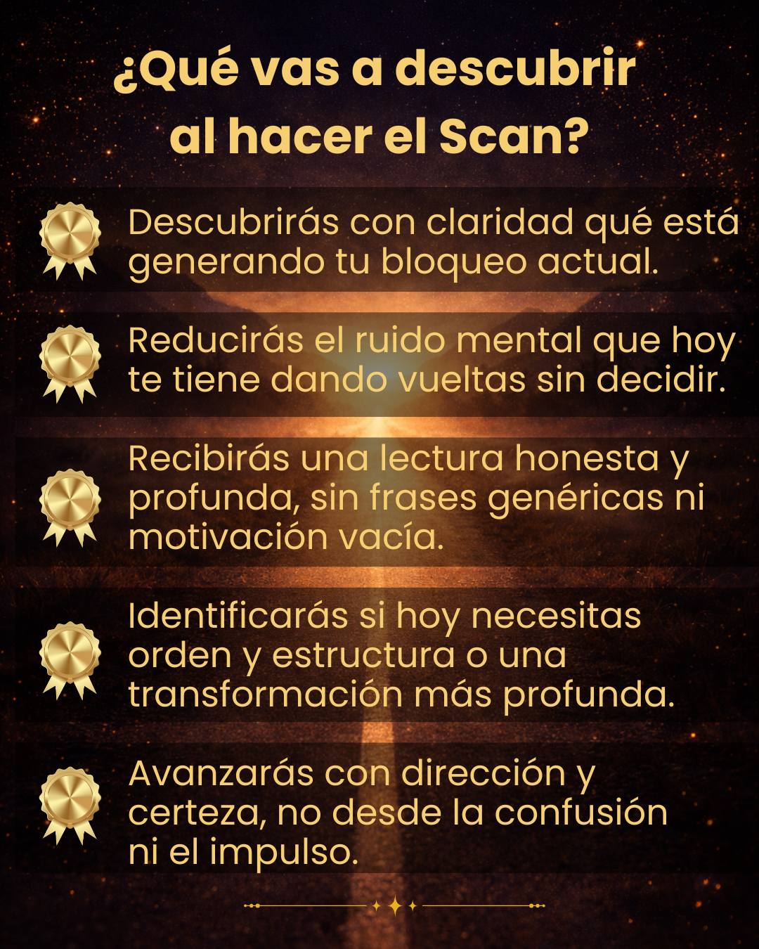 El Scan del Alma te ayuda a entender qué tipo de acompañamiento necesitas ahora (si es que lo necesitas) y desde dónde iniciar sin perder tiempo ni energía.